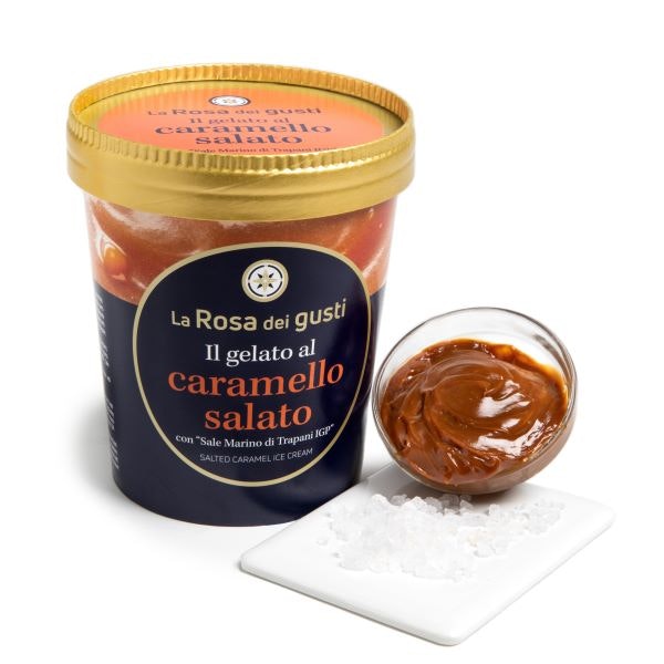 La bontà cremosa del gelato tradizionale sempre a portata di mano. Un vero e proprio peccato di gola l’unione tra gelato al caramello variegato al caramello e Sale Marino di Trapani Integrale IGP.